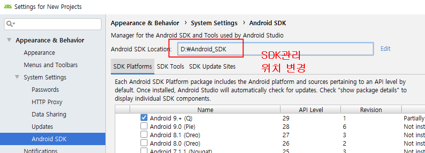 SDK는 따로 폴더를 만들었다. (D 드라이브)