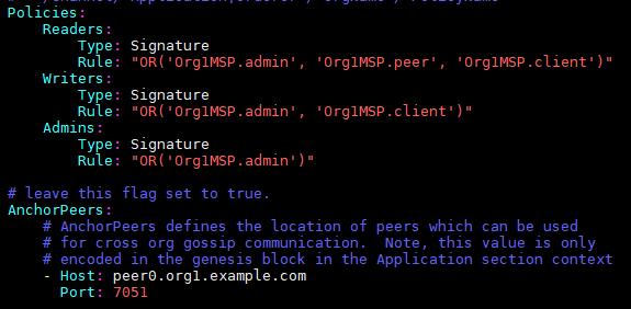 그리고 Rule에는 Type에 따른 구체적인 세부 정책을 입력받습니다. - AnchorPeers : 앵커피어에 관한 설정을 입력. 입력값으로는 호스트와 포트를 입력받으며, 조직마다 여러개의 앵커 피어를 설정할 수 있습니다.